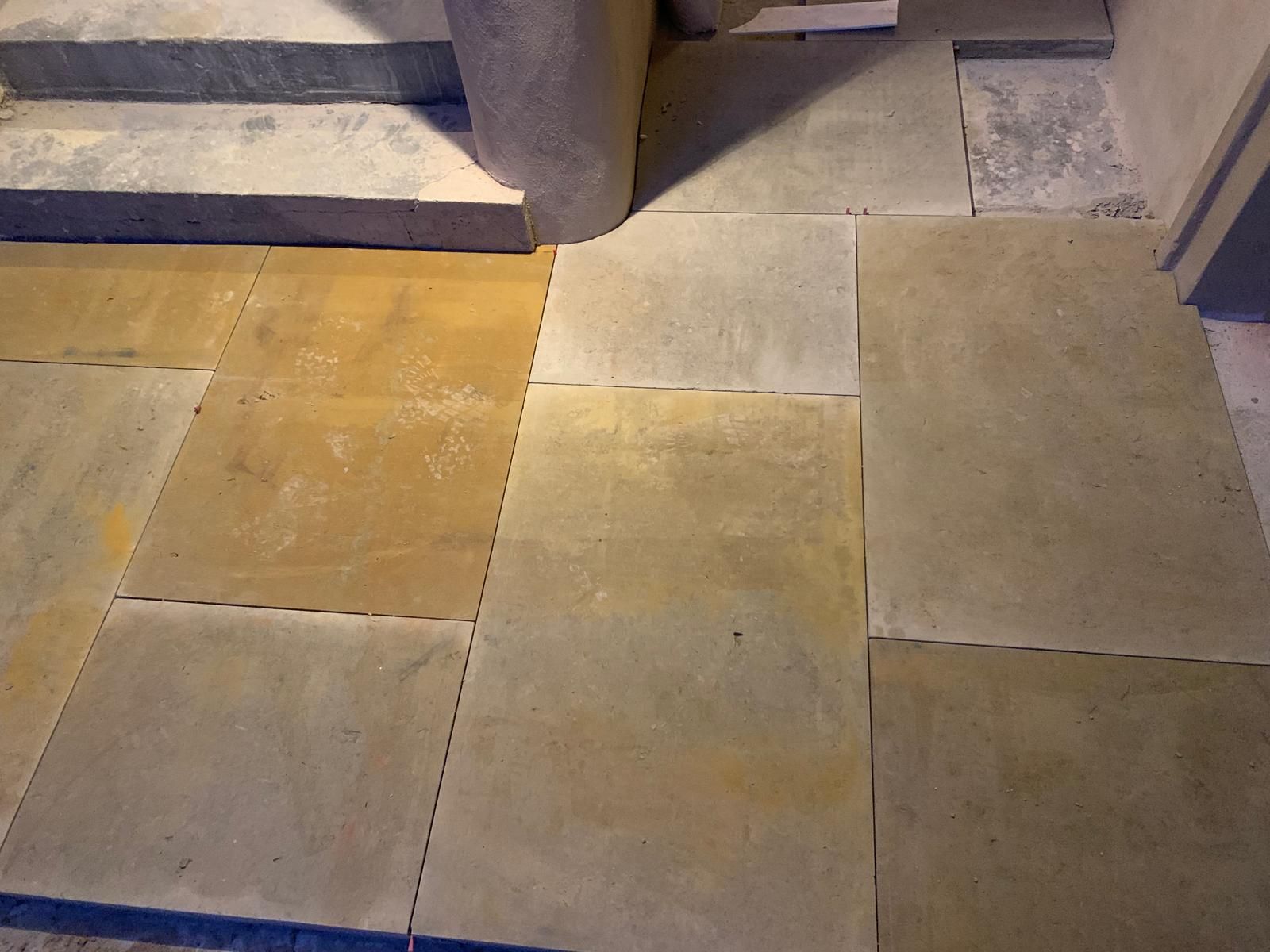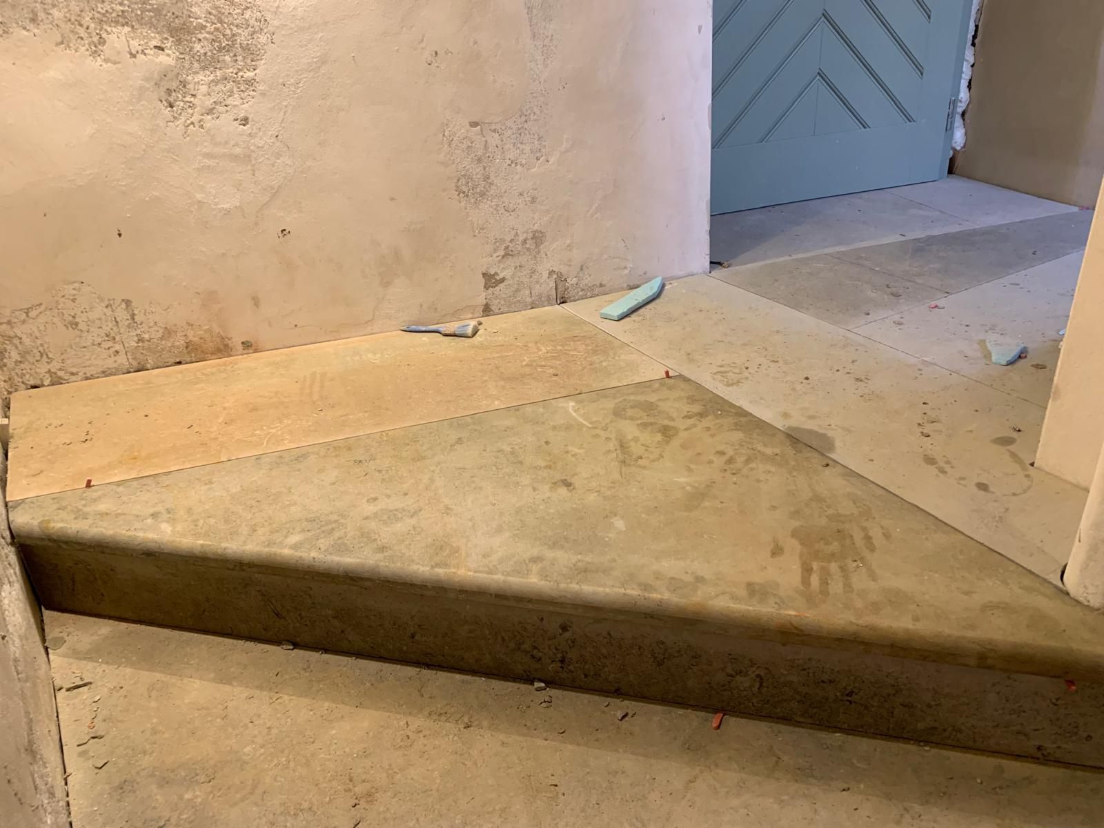 Použit byl kvalitní český řezaný pískovec, opracovaný do kvádrů a kostek, který je pro podobné objekty ideálním materiálem díky své pevnosti, dlouhé životnosti i snadné údržbě. Pískovcová dlažba a kamenná dlažba na schodech vytvářejí reprezentativní a dlouhodobě odolný povrch, který přirozeně navazuje na architekturu domu a zároveň splňuje nároky na každodenní provoz v interiéru i exteriéru.