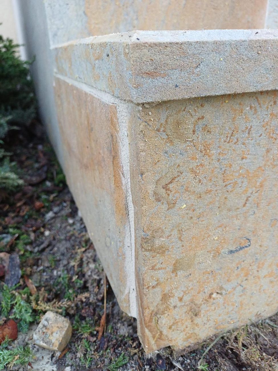 Stavba venkovních kamenných schodů s podestou a kamenným květináčem v obci Lochenice