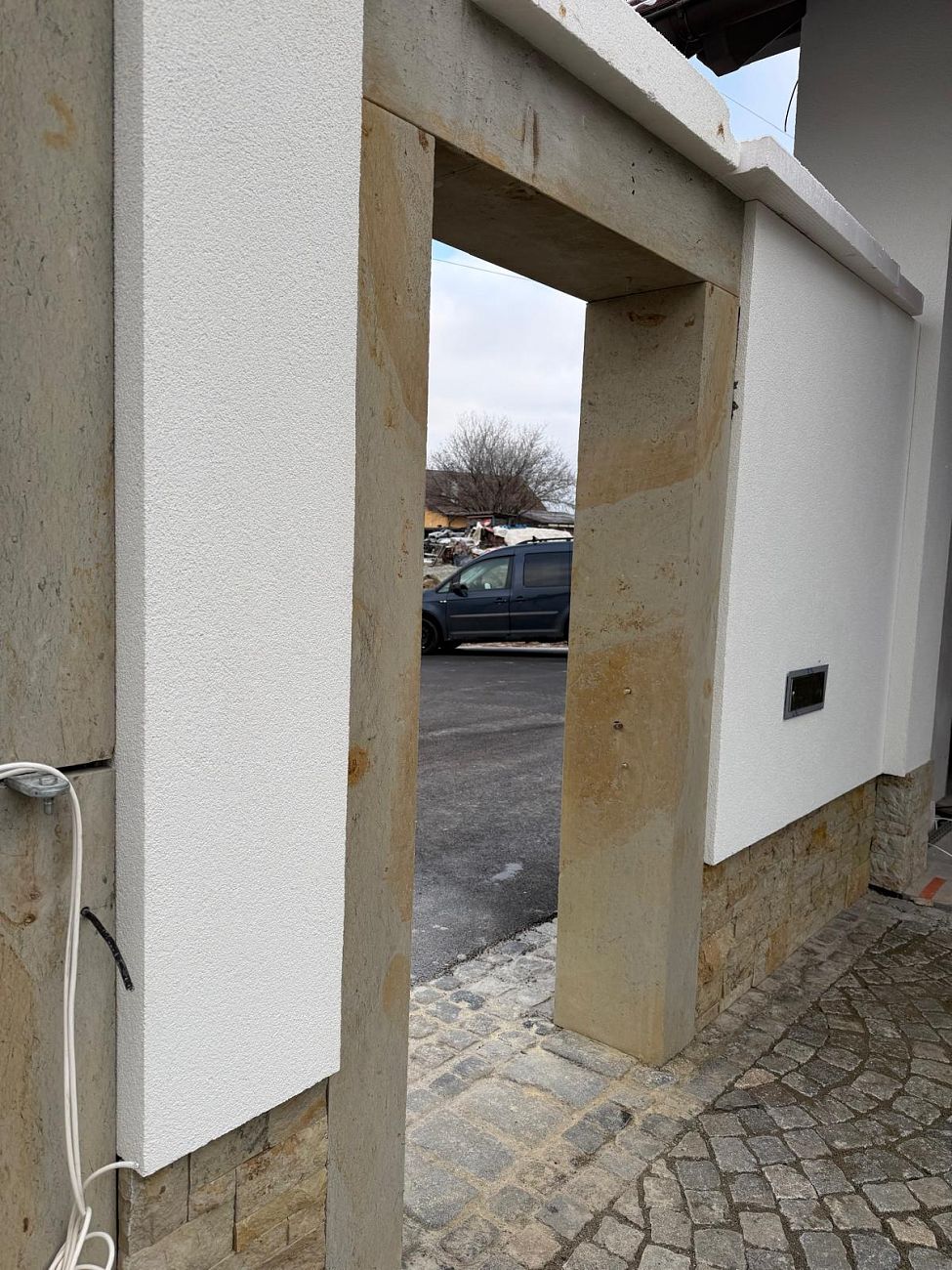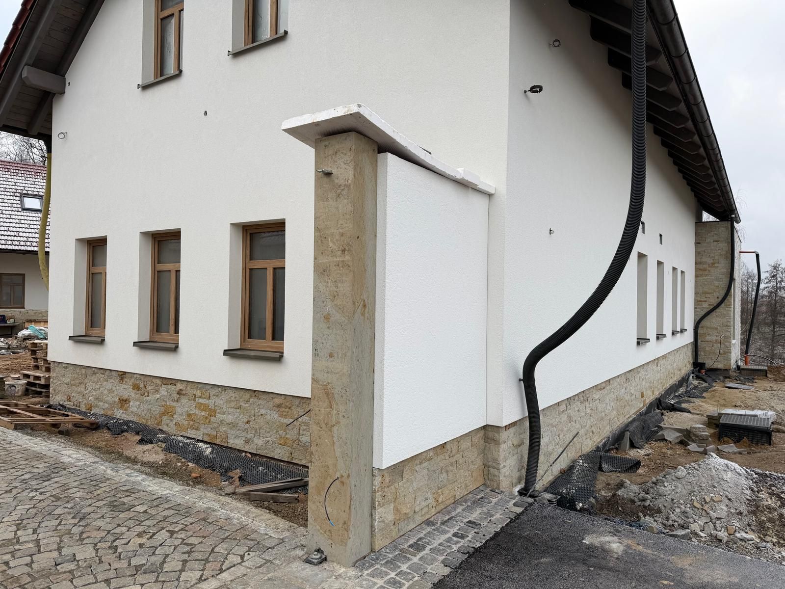 Tato realizace navázala na dřívější kamenické práce na stejném objektu, kdy jsme provedli obložení soklu domu pískovcem i další práce s kamenem. Díky tomu nová kamenná futra přirozeně ladí s budovou a celý areál působí jednotně, kompaktně a nadčasově.